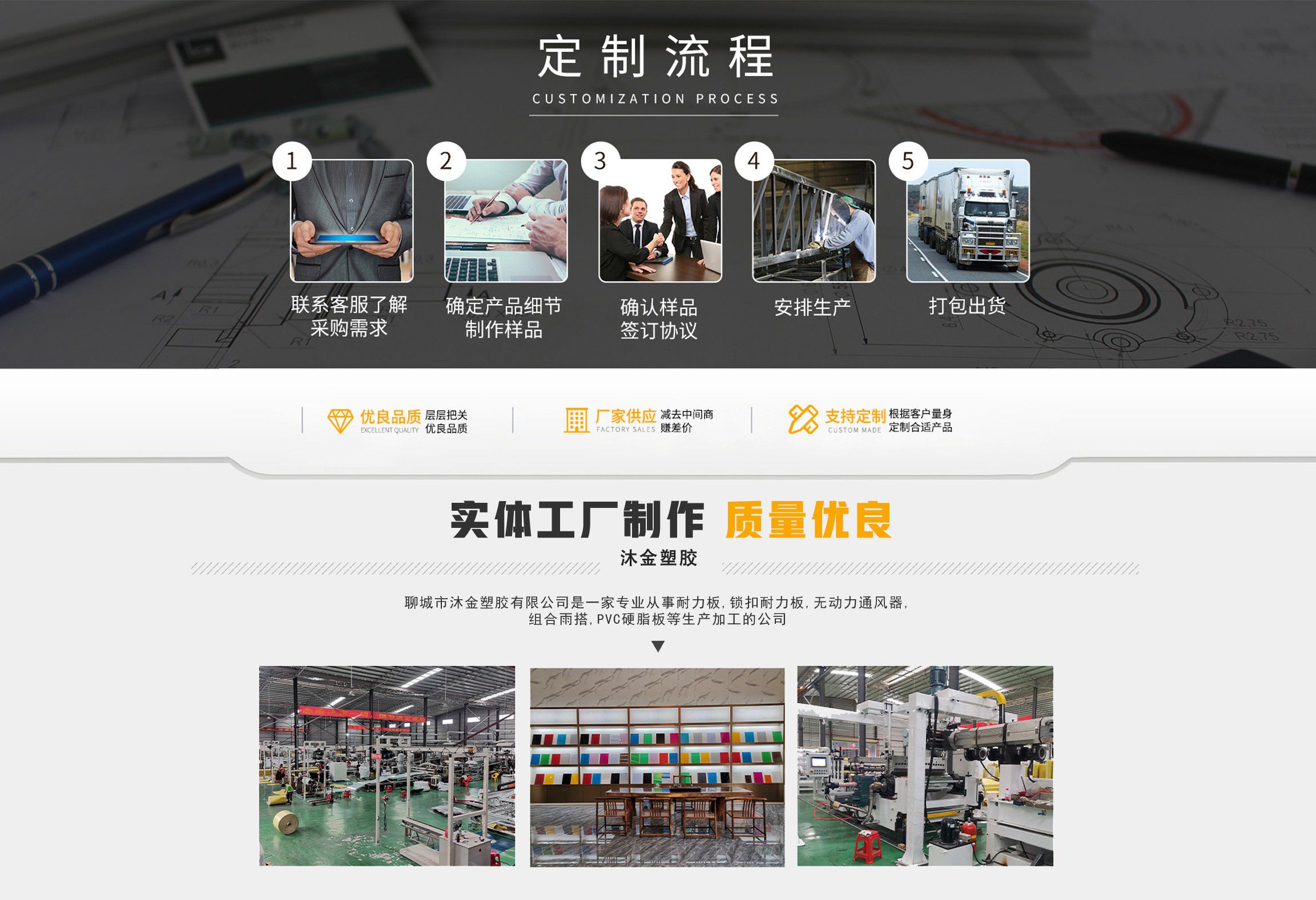 聊城市沐金塑膠有限公司注冊資金2180萬元,占地20000余平方,擁有自建廠房15000平方,員工100余名。10余年來,公司主營耐力板,鎖扣耐力板,耐力板深加工,無動力通風(fēng)器,組合雨搭,PVC硬脂板,耐力板廠家等板材的發(fā)展戰(zhàn)略,逐漸成長為綜合性企業(yè)。 公司擁有多條板材共擠生產(chǎn)線,采用世界知名品牌進(jìn)口原材料和先進(jìn)工藝,依據(jù)完善的ISO9001質(zhì)量管理體系和ISO14001環(huán)境管理體系,為產(chǎn)品的卓越品質(zhì)提供了強(qiáng)有力的保證。憑借過硬的創(chuàng)新能力和堅實的硬件基礎(chǔ),贏創(chuàng)已成為國內(nèi)領(lǐng)先的熱塑性板材生產(chǎn)商,產(chǎn)品被廣泛應(yīng)用于建筑業(yè)、農(nóng)業(yè)、工業(yè)、廣告業(yè)、安防行業(yè)及DIY領(lǐng)域。 公司始終致力于通過提供最優(yōu)的板材應(yīng)用解決方案,為客戶創(chuàng)造最高的價值;堅守創(chuàng)新、質(zhì)量、靈活、服務(wù)和速度的核心價值觀;堅持“完美的產(chǎn)品需要完美服務(wù)的支持”的經(jīng)營理念,努力實現(xiàn)成為世界領(lǐng)先的板材與解決方案供應(yīng)商的夢想。 在未來,公司將立足客戶需求,不斷改變和完善現(xiàn)有產(chǎn)品,拓展產(chǎn)品線和充分開發(fā)板材的應(yīng)用領(lǐng)域,為客戶創(chuàng)造全方位的價值。同時更好地實現(xiàn)員工的價值,實現(xiàn)公司團(tuán)隊的價值。我們將與您一起創(chuàng)贏未來! 企業(yè)使命:成為世界領(lǐng)先的板材與解決方案供應(yīng)商。 公司愿景:通過提供最優(yōu)的板材應(yīng)用解決方案,為客戶創(chuàng)造最高的價值。 核心價值觀:質(zhì)量...